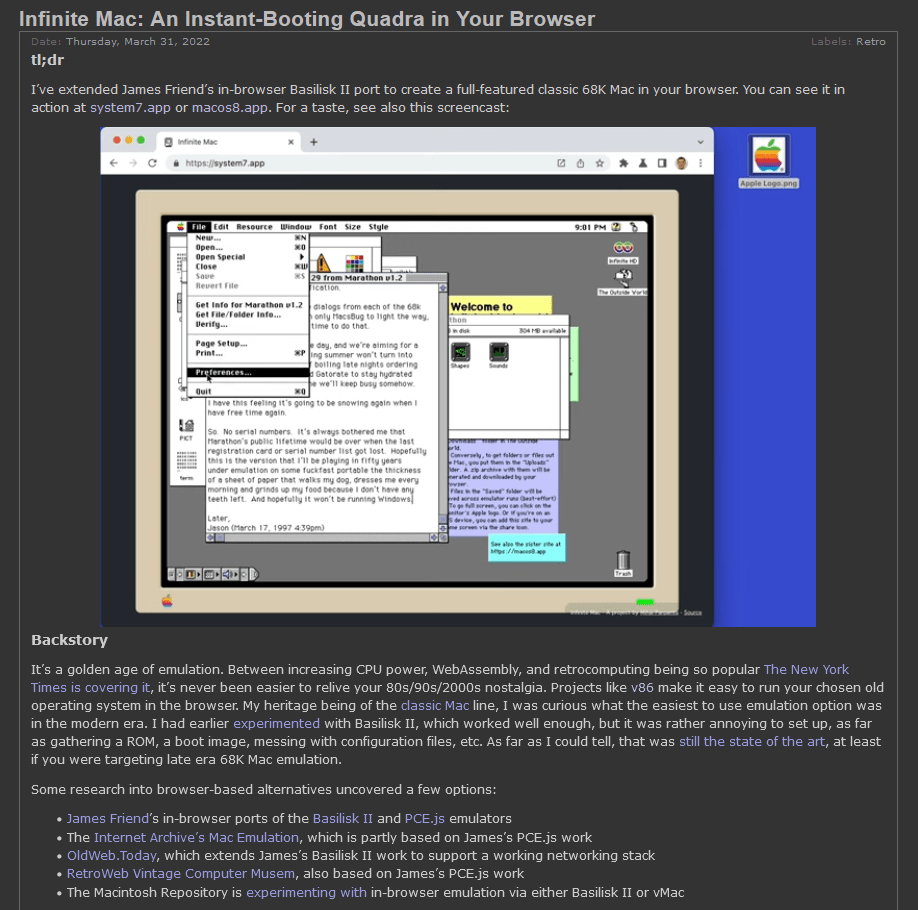Projeto Infinite Mac (System7.app / MacOS8.app / MacOS9.app / Kanjitalk7.app): a oportunidade mais fácil de sentir o look and feel do MacOS clássico é checar esses emuladores de Mac clássico direto no browser. Não testei a fundo, mas aparentemente dá para instalar aplicativos externos desde que se faça o download pelo próprio emulador, mas não deve dar pra salvar as configurações da sessão de uso. Iniciei esse post em agosto, e vi que o projeto está sendo atualizado constantemente, sendo que dia 30 de Outubro de 2022 lançaram o emulador web de PowerPC/OS9.