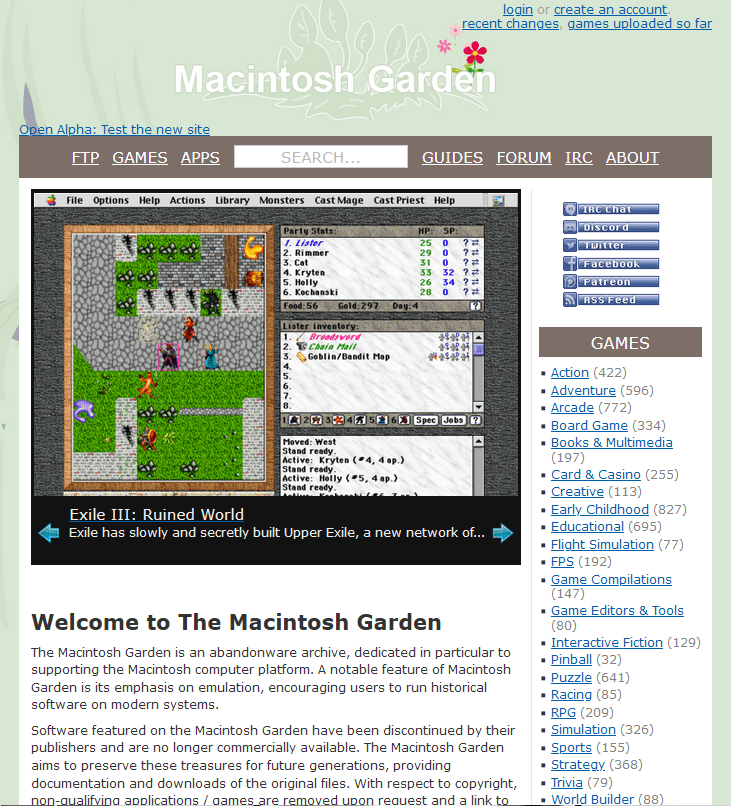 Macintosh Garden: um repositório de abandonwares para Mac, com muuuita coisa. É o tipo de site que dá vontade de comprar um Mac antigo só pra testar os milhares de programas disponíveis, para diversas gerações dos compuitadores da Apple. Claro que dá para testar via emulação, mas em um sistema original performance e estabilidade são sempre melhores. Ainda assim, navegar o conteúdo do site já é uma prazerosa distração.